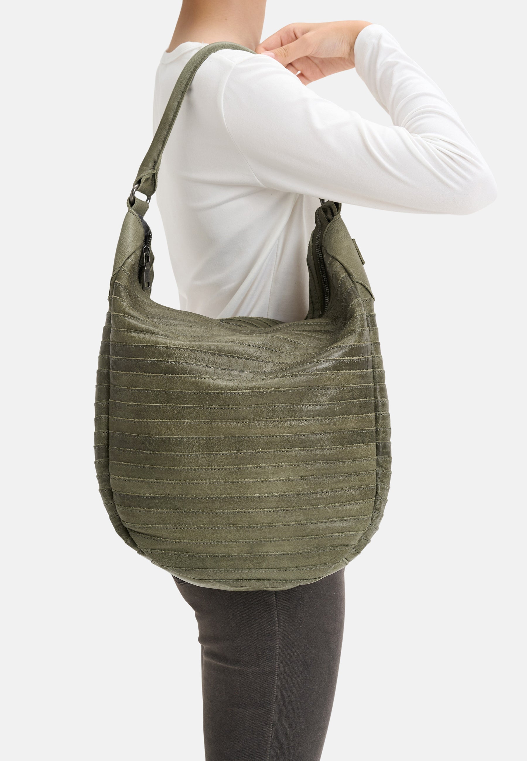 Das handgewachste, veredelte Leder verleiht ihr Charakter und Tiefe, während silberfarbene Metalldetails dezente Akzente setzen. Dank der flexiblen Tragemöglichkeiten – als Shoulder- oder Crossbody-Bag – passt sie sich deinem Alltag mühelos an. Im Inneren sorgen mehrere Steckfächer und ein Reißverschlussfach für übersichtliche Organisation.