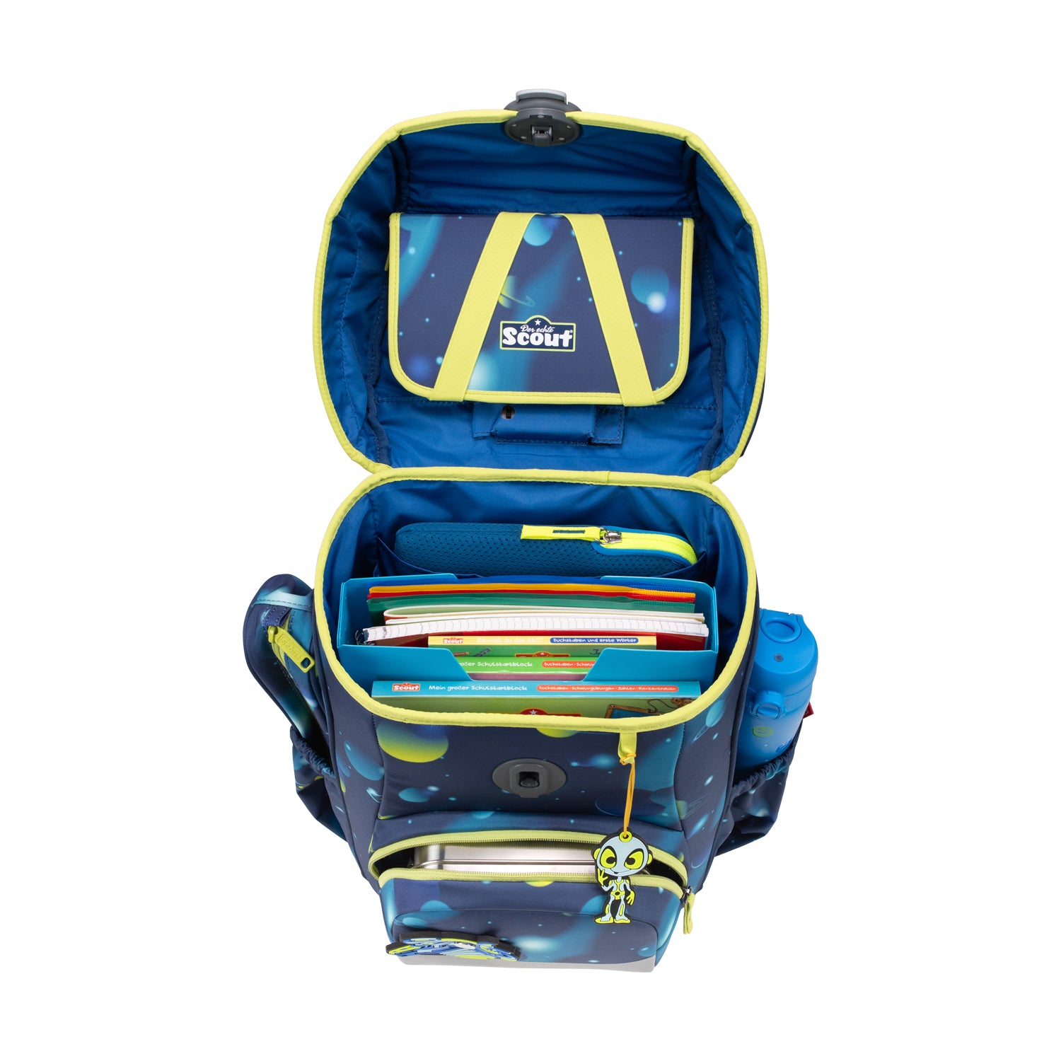 Schulranzen aus recycelten PET-Flaschen, ca. 1.200 g 21.5 l. Mitwachsendes, höhenverstellbares Tragegurtsystem.Enthält: 2 Funny Snaps und 1 Anhänger, Sportbeutel, Federmäppchen mit Staedtler-Qualitätsbuntstiften und Schlamperetui. Mit retroreflektierenden Flächen. Inkl. 2 AAA-Batterien.