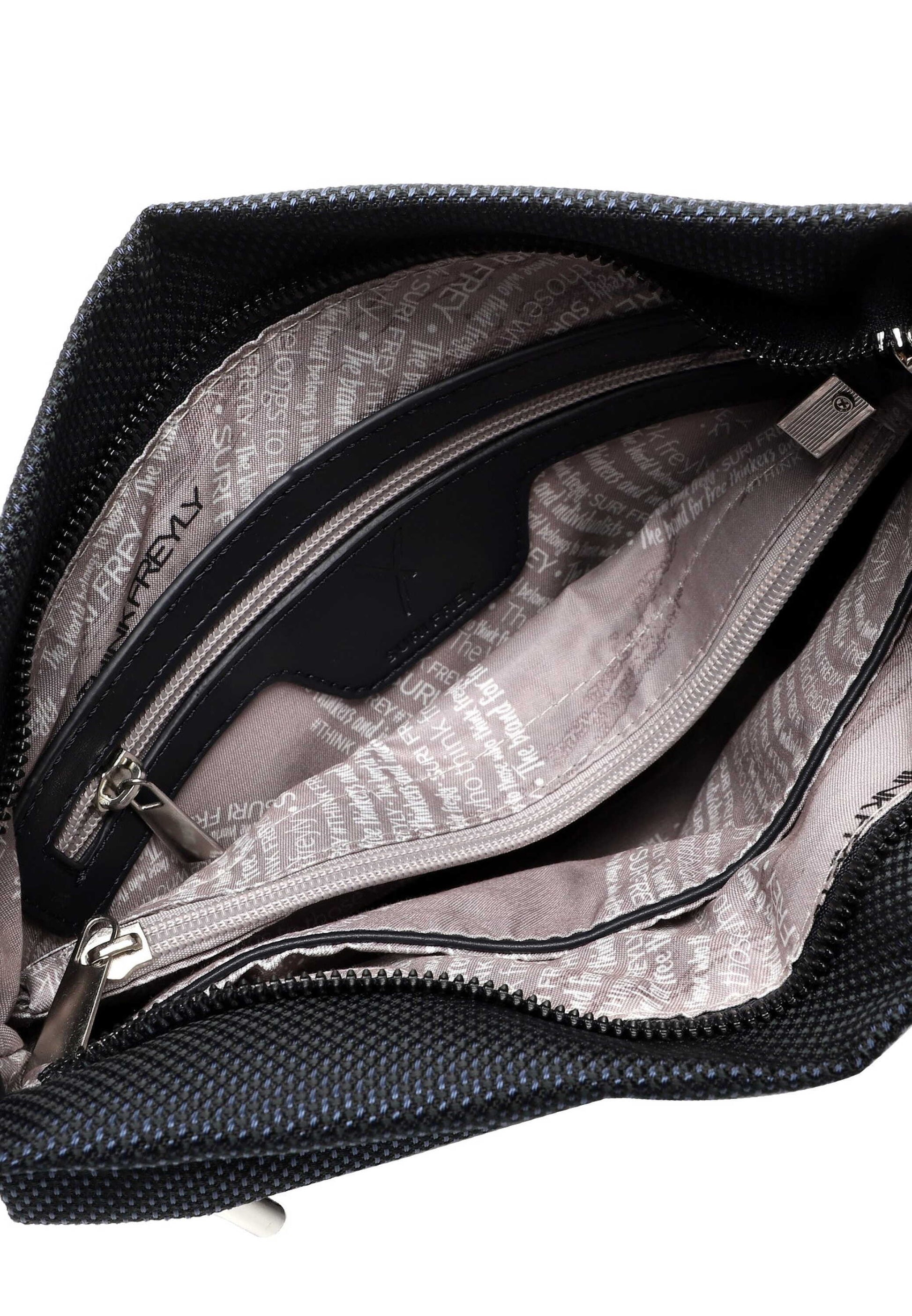 SURI FREY - die Marke für “Freygeister" Eine Handtasche ist der Spiegel der Persönlichkeit einer Frau. Ob aufgeräumt oder leicht chaotisch - Frauen lieben sie einfach! Die Umhängetasche SFY SURI Sports Marry kommt in Uni-Design mit Reißverschluss und sieht einfach toll aus. Ein unverzichtbarer Begleiter im Alltag - die Umhängetasche. Es ist so einfach, für alle Eventualitäten gerüstet zu sein. Die Produkte des beliebten Labels SURI FREY stehen für tierfreundliche Styles sowie Designs und verwenden gänzlich vegane Inhaltsstoffe. Das beweist auch das durch die PETA vergebene Logo „PETA-Approved Vegan“, das für beste Standards bei der Produktion ohne tierische Inhaltsstoffe steht. Das Modell besteht aus Nylon und lässt sich mit einem Reißverschluss verschließen. Ein optisches Highlight ist die Umhängetasche mit Nylon-Optik und dem Uni-Design. SURI FREY kennt die Wünsche ihrer Bewunderer genau und sie weiß, was sie verbindet - Lebensfreude und Freundschaft. Und genau das spiegeln die Modelle des angesagten Modelabels wider. Ordnung ist das halbe Leben. Ein übersichtliches Hauptfach und eine Reißverschluss-Mittelwand sind in der Tasche integriert. Ein Reißverschlussfach sichert Portemonnaie, Handy und andere wichtige Dinge vor Taschendieben z. B. in der vollen Straßenbahn oder beim Shoppingtrip in der Fußgängerzone. Rückfach sorgt für zusätzlichen Stauraum und erlaubt den schnellen Zugang zu Dingen, die man zügig zur Hand haben möchte. Ein eher festes Material sorgt bei SFY SURI Sports Marry dafür, dass wichtige Dokumente keine Knicke bekommen. Für das besondere Extra sorgt die Applikation mit dem Anhänger, die direkt ins Auge fällt. Als Umhängetasche ist dieses Modell mit dem angenehmen, längenverstellbaren und abnehmbaren Umhängeriemen zu tragen. Manchmal braucht man etwas mehr Platz in der Tasche. In dieses Modell passt einfach alles - Portemonnaie, Smartphone und zur Not noch ein Tablet, das einem die Wartezeit auf die Freundin versüßt, wenn sie mal wieder zu spät kommt.